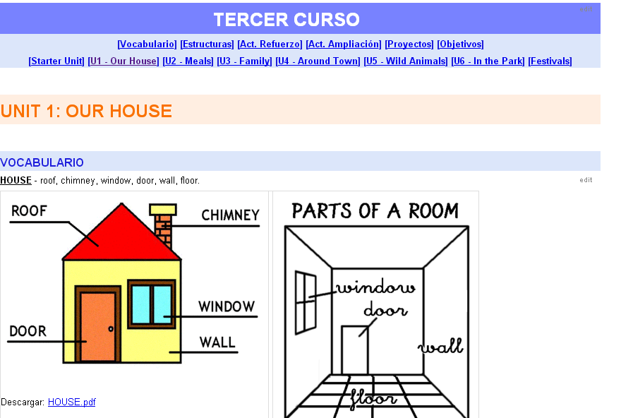 En la web http://letsticenglish.wikispaces.com/ nos ofrecen los temarios de 3º de primaria en ingles en pdf para descargar el vocabulario,una canción para aprender las preposiciones, actividades on-line. Dejo el enlace de la unidad 1