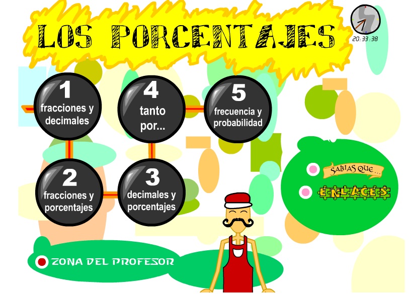 Empezamos con esta actividad de la Junta de Andalucía donde vemos el tema dividido en varios apartados: decimales y fracciones,tanto por ciento, frecuencia y probabilidad, fracciones y porcentajes y decimales y porcentajes.